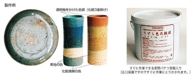 従来の化粧はタイミング判断が必要な半生掛け、或るいは化粧掛け後に再素焼といった作業が必要な場合があり、多くの失敗とわずらさしさがありましたが、この色化粧は素焼き素地に釉薬感覚で化粧掛けを行い、乾燥後釉薬をかけてそのまま本焼きができます。
