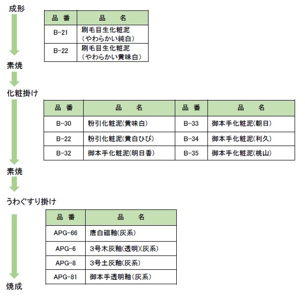 | 厚化粧掛け | やや黄味の白 | APG-6 三号木灰釉 | 1230℃ | 還元焔 | 1.3 | 耐火性のあるやや荒い 含鉄粘土 |