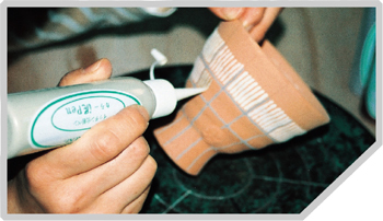 従来のイッチン技法では化粧泥の濃度調整が難しく、うまく盛り上がった線を描くのに一定の経験を要しました。