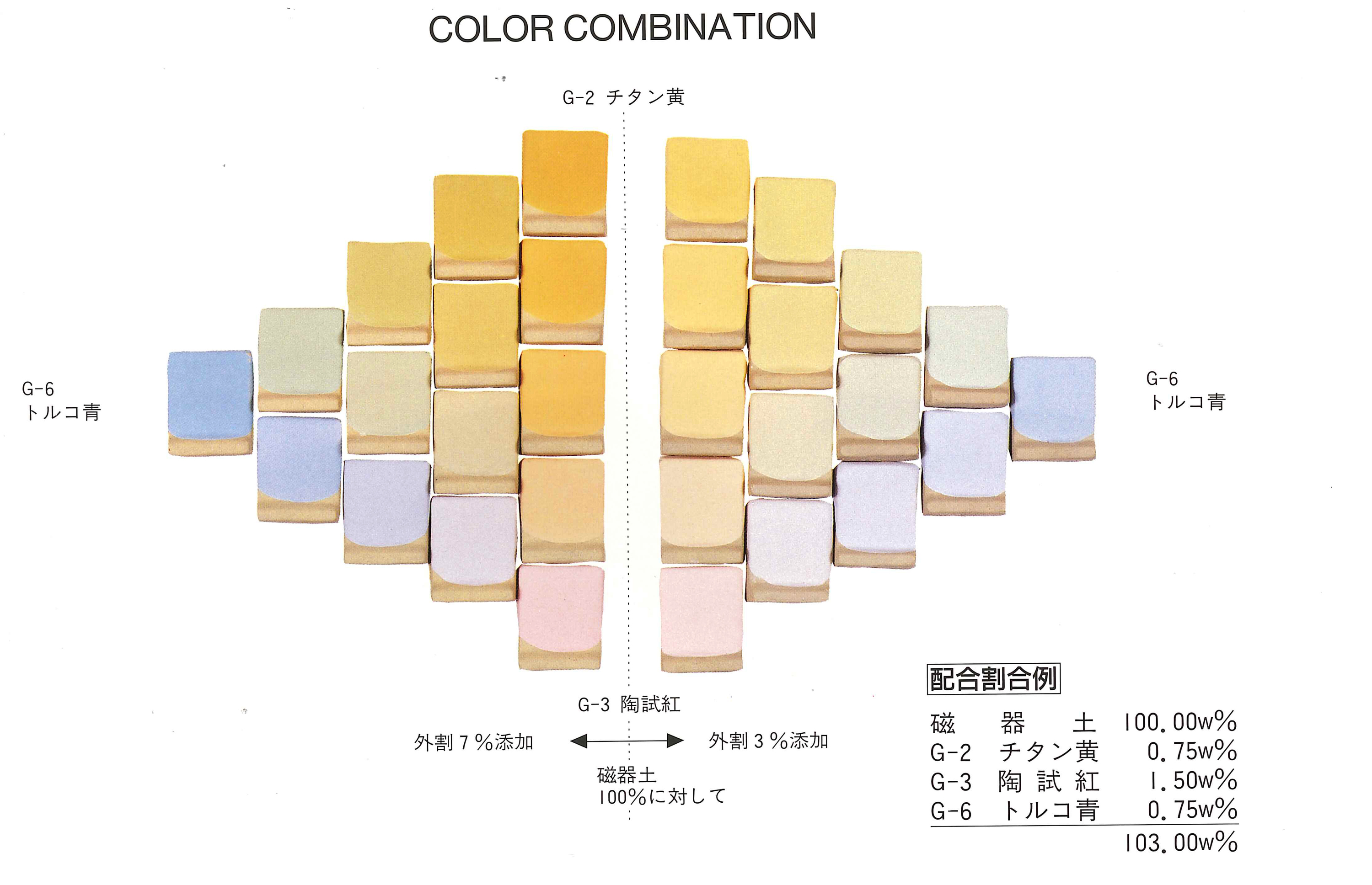 | 色素地と練り込み顔料 強い発色効果が得られる陶土 ・陶土単体で出来るだけ白く焼き上がる粘土(相対的に添加量が少なくて強い発色効果) |