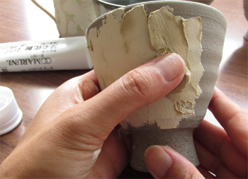 (素焼後は化粧の塗り付け作業が簡単で、水洗い後再トライできます)