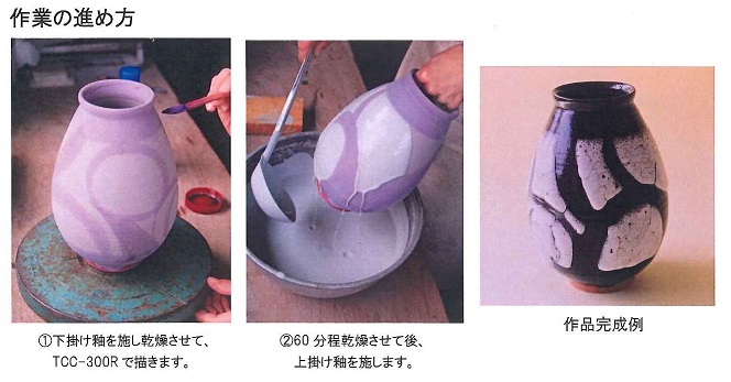 釉上で撥水効果を発揮します。 下掛施釉後乾燥を待って上掛施釉(杓掛、 浸掛)を施すだけで撥水効果が出る。 (通常撥水剤としても使用可)